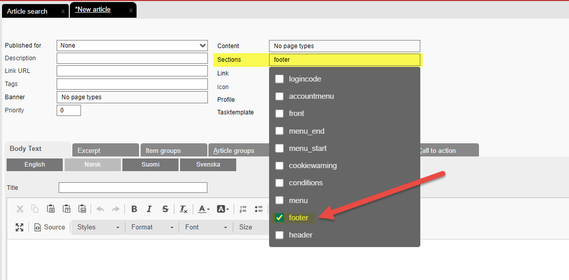 Under the Article groups tab, you control which article group(s) the article should be published under. You can read more about how to create article groups and their properties here.