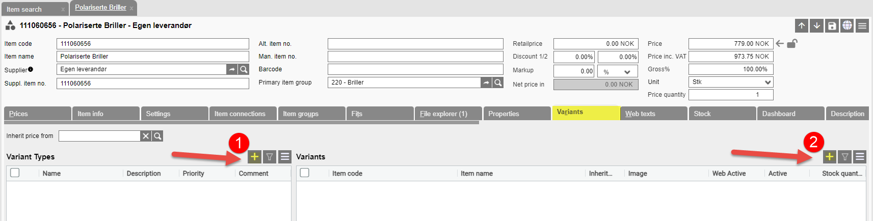 In the example below, we have created such an item. Under the Variants tab on the itemcard, we have added "Size" under variant type, and added the variant items under variants. You must specify on each individual variant which size it is, even if the item has the size in the name. Other settings here are whether the variants should inherit the price from the template (if this has a price) or whether they are controlled by their own price and whether the item should be web-active/active.