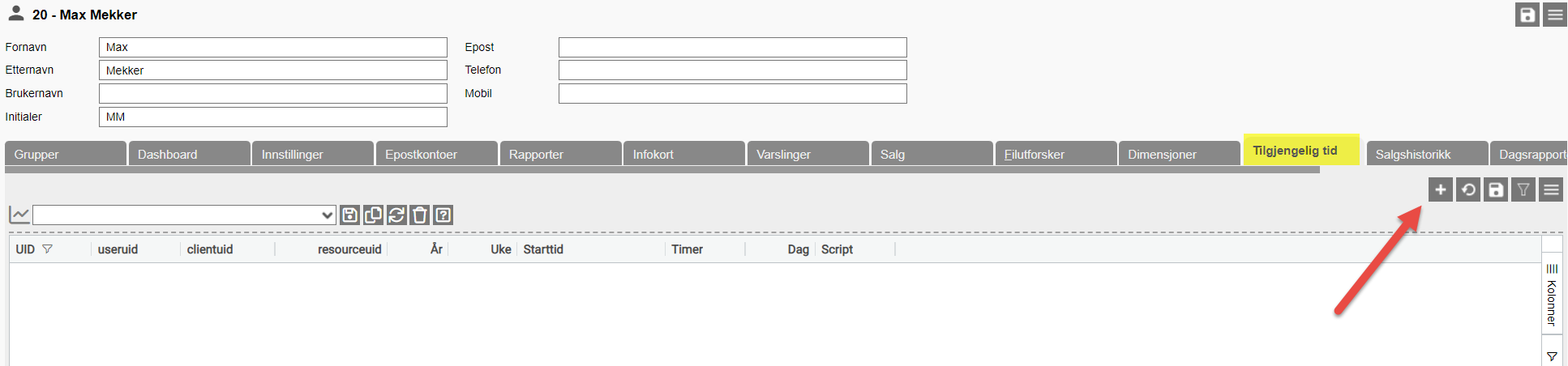 On each individual resource there is a tab called Available time/Tilgjengelig tid. Here you enter when and how long you are free. It is worth mentioning that if you are free all day to do missions, you must enter several logs on the same day. That is if you are free for 7.5 hours and a customer books an appointment from 08.00, and the service the customer has only ordered service for 2 hours, the whole day will be booked and not available to others. Therefore, intervals should be entered, so that several customers can book among available times on the same day.