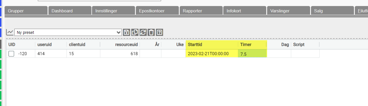 You will then get a line that looks like this. Here you enter the desired start time and the number of hours from the start time that are available. When these two fields are filled in, the year, week and day fields will be pre-filled. Remember to save.