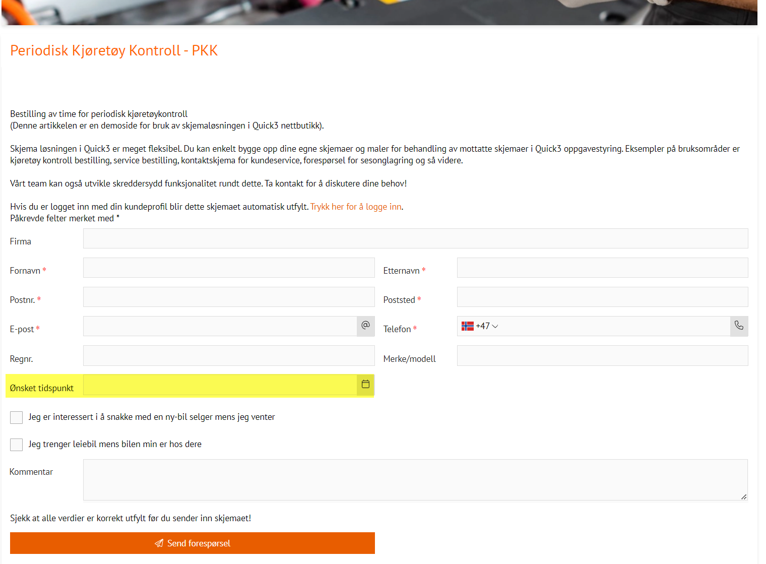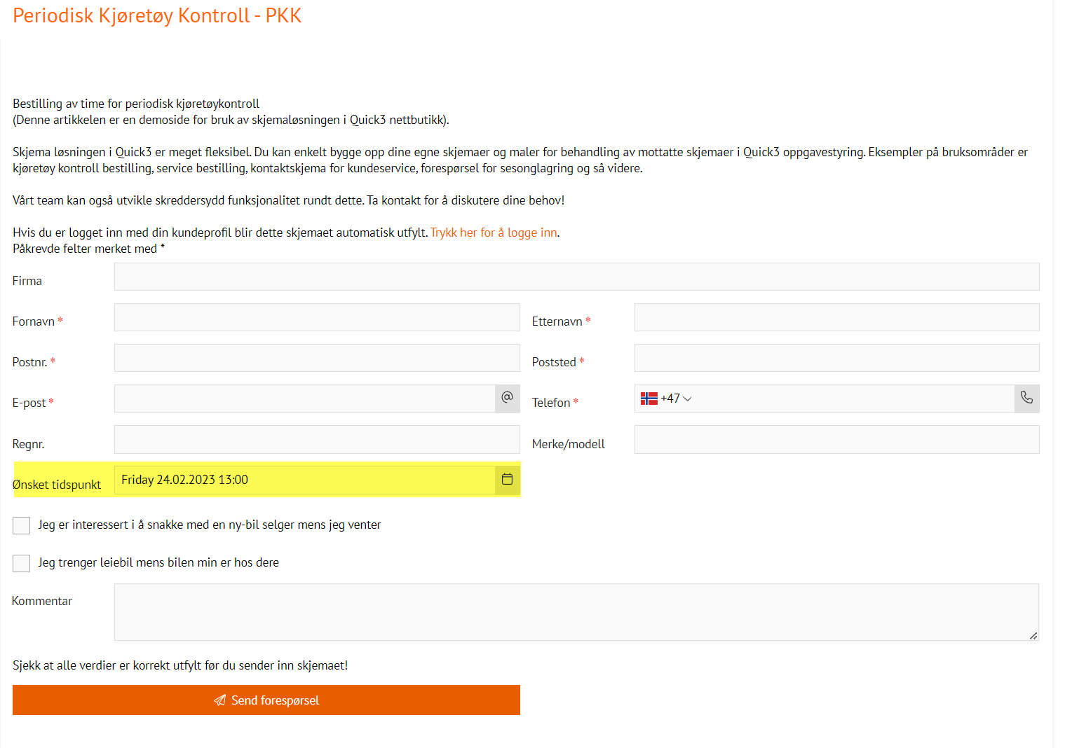 In Quick3, you have the option of setting aside free time for a resource/employee, so that customers who order services through the web form can choose between free time slots. This function may be useful for services with a standard duration, for example EU control.