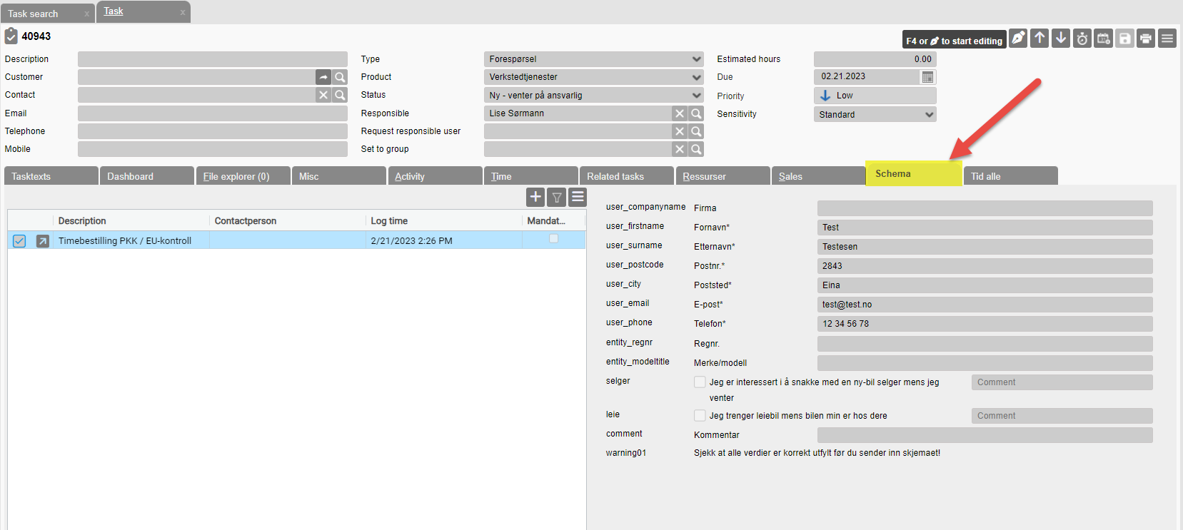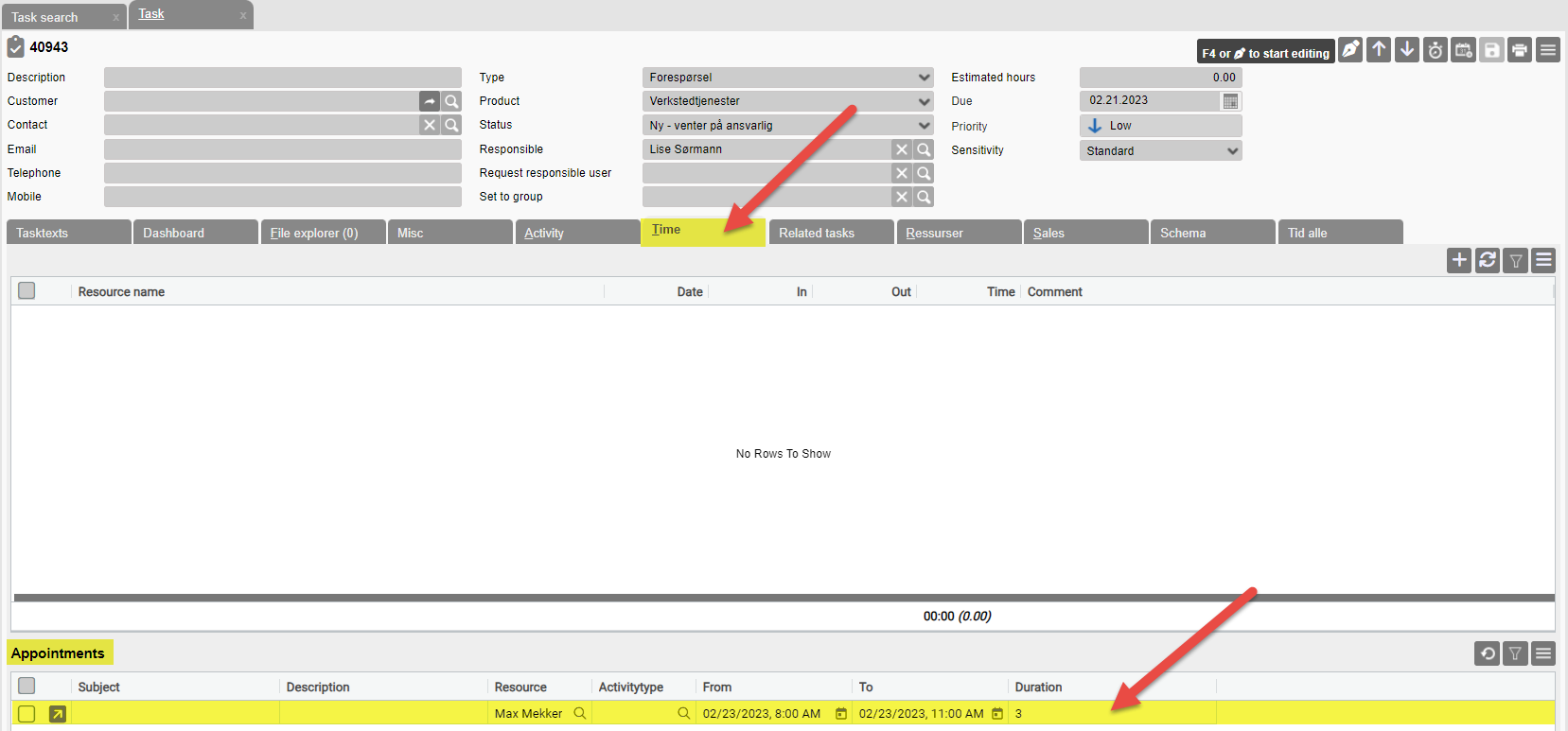 The customer information can be found on the form tab on the task, and the time that the customer has chosen will appear under the time tab where the agreed time on the resource will be displayed. In addition, the task will appear in the calendar.