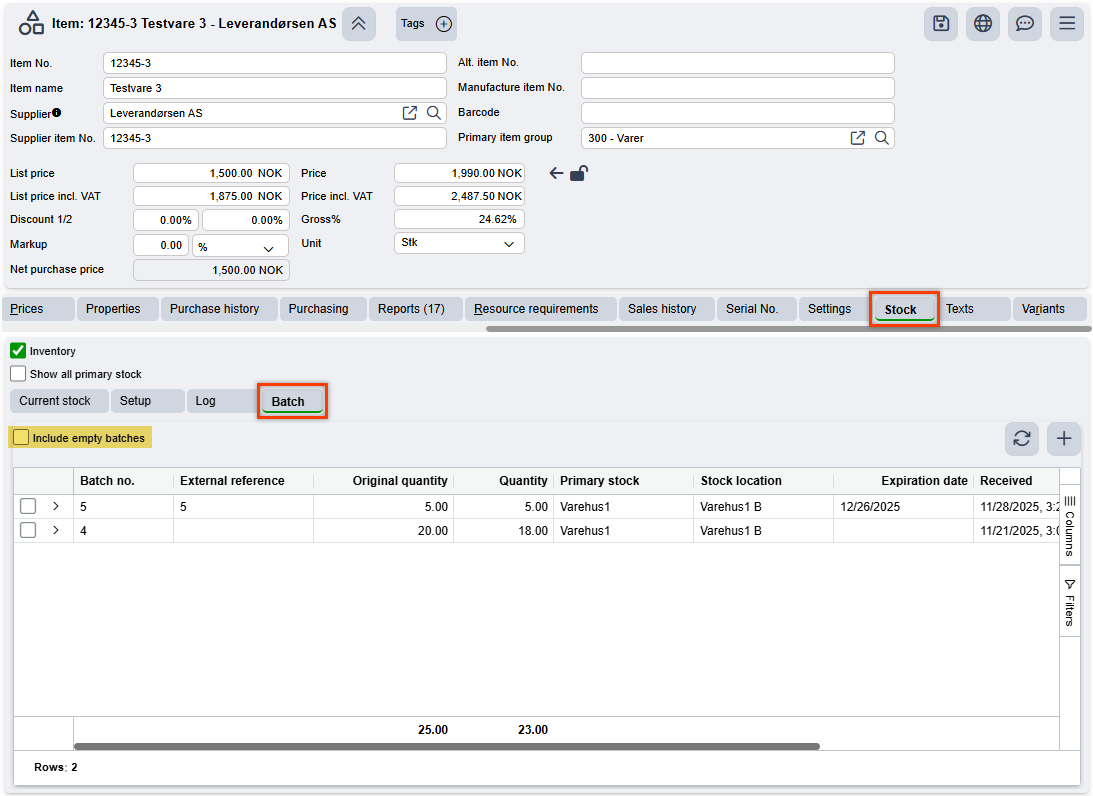You will notice a new column in the Order and Offer views called Batch. When selling an item without manual batch handling enabled, the system will automatically choose the oldest batch in your inventory. If there are not enough items in that batch, the system will continue from the next available batch. If several batches are used to complete the amount on the order, an average cost price based on the batches used will be calculated and displayed on the order line.