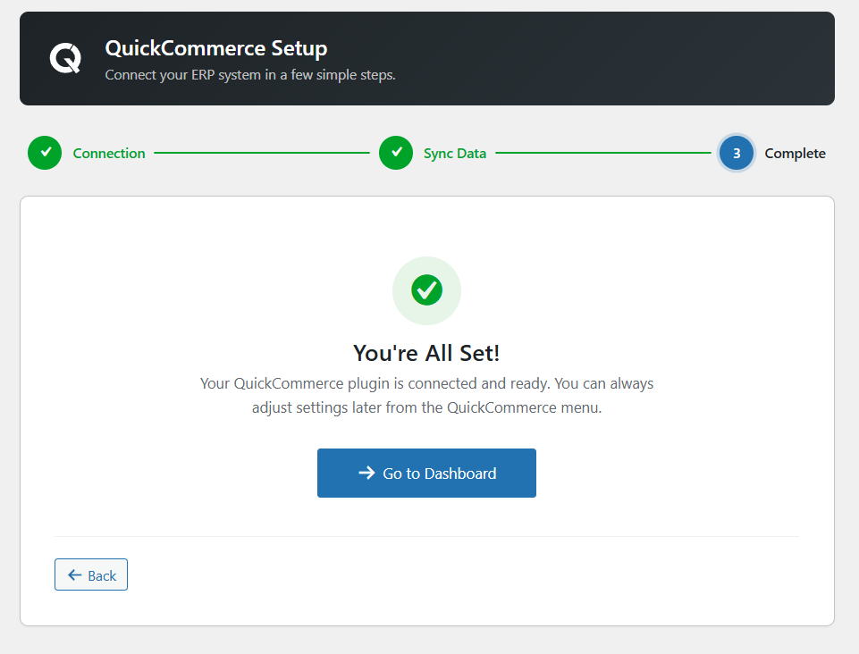 Review the setup summary and click Go to Dashboard. You will be redirected to the regular settings interface. QuickCommerce is now fully configured and running.