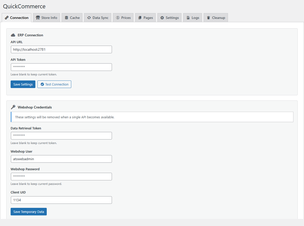 Additional fields for backward compatibility with the legacy API may appear below the main connection settings. These include Data Retrieval Token, Webshop User, Webshop Password, and Client UID.