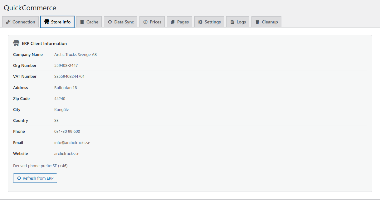 Displays store information retrieved from the connected Q3 ERP system. This tab is read-only and shows your ERP client details including company name, organization number, VAT number, address, phone, email, and website. Click Refresh from ERP to re-fetch the latest information from your Q3 instance.