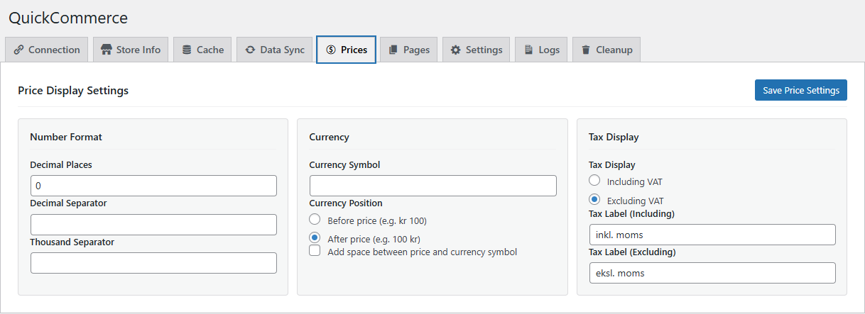 A: Navigate to QuickCommerce > Settings > Prices tab to configure decimal places, separators, currency symbol, position, and tax display options.