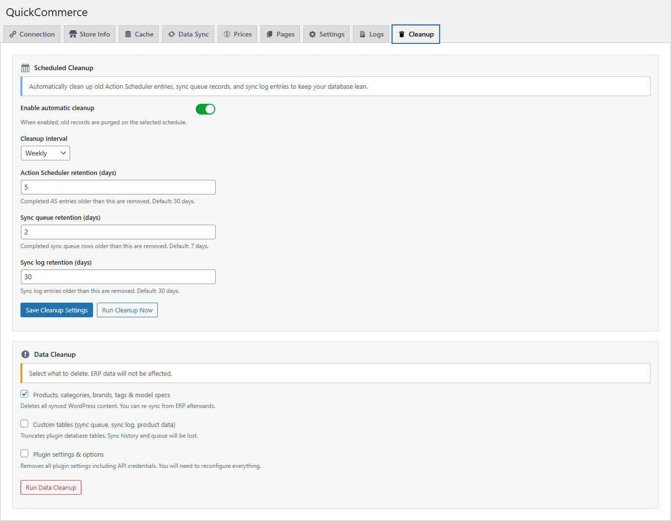 A: The Clear All Data operation in the Cleanup tab removes all synced products, categories, brands, and model specs from WordPress. Your plugin settings and all original data in Q3 ERP are preserved. You can re-sync afterward.