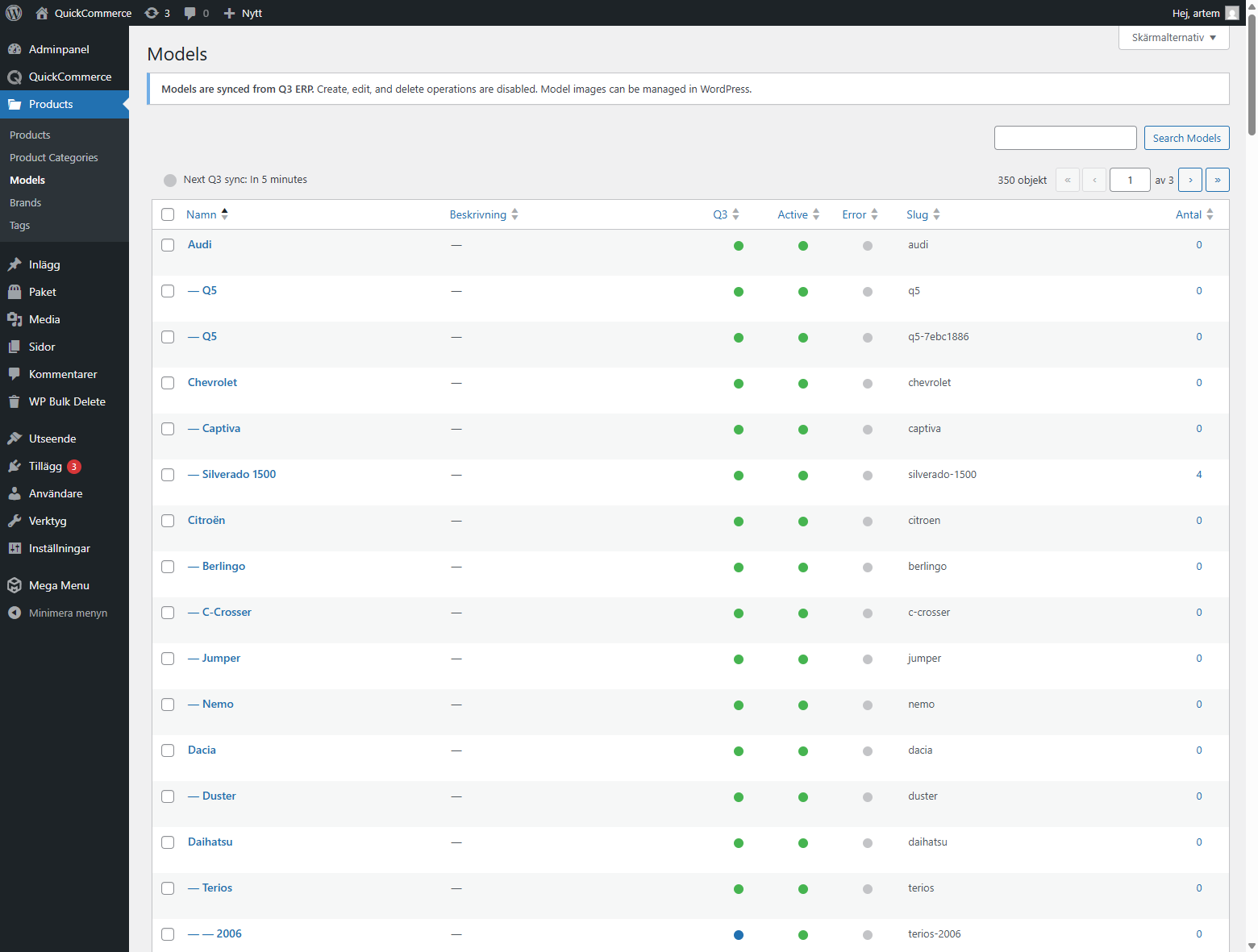 | Model not syncing | Check the Error column in the models list (hover for details). Try manual Q3 Sync from row actions. Verify the model is active in Q3. |