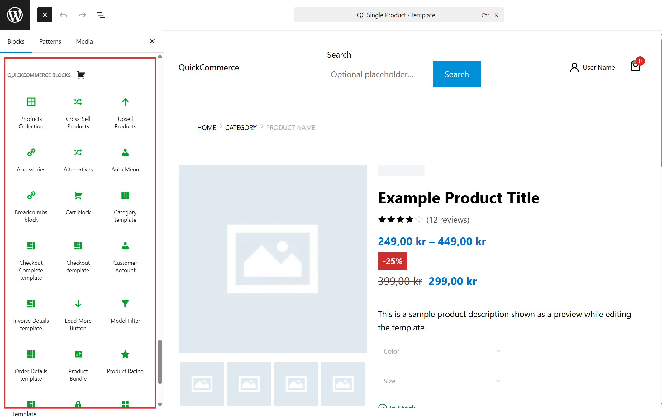 A: Open the WordPress Site Editor, click the block inserter (+), and search for QuickCommerce blocks or browse the QuickCommerce category. All blocks use green icons for easy identification.
