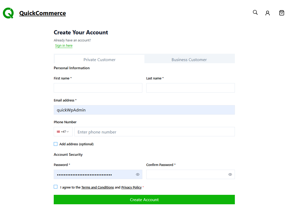 A: The registration form offers separate tabs for private and business customers. Business accounts include additional fields for company name and organization number.