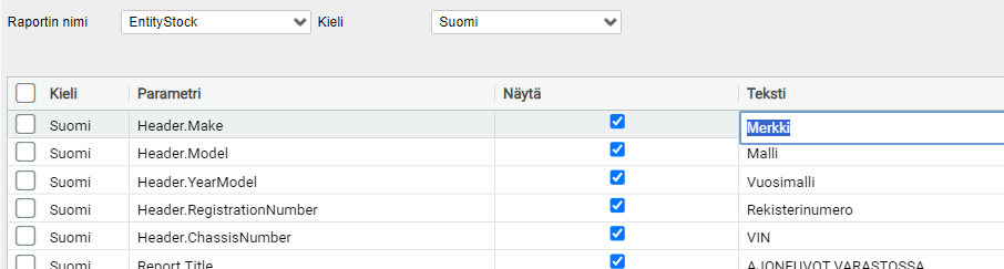 Valitse ensin mitä raporttia haluat muokata, ja sen jälkeen kieli.