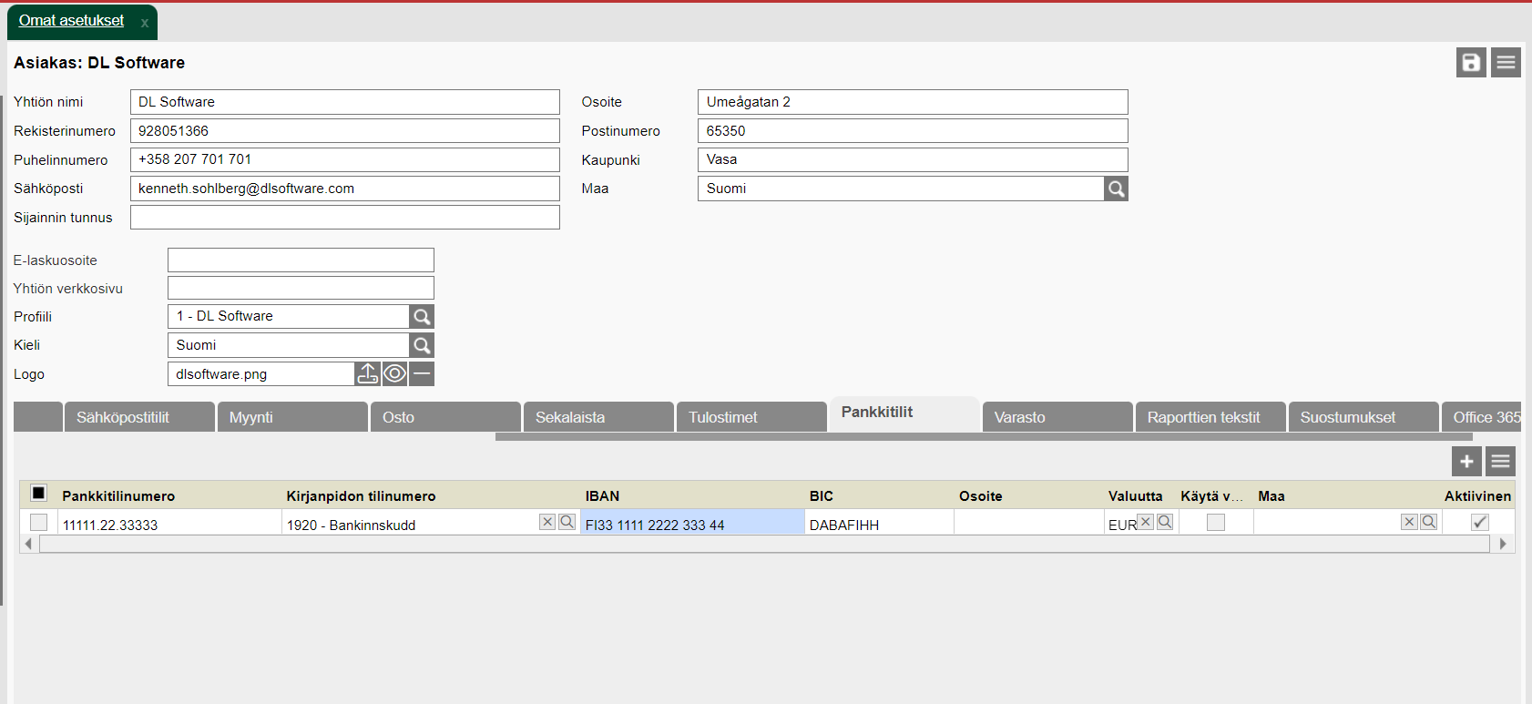 Pankkitilinumero lisätään Omissa asetuksissa välilehdelle "Pankkitilit". Tämä on välttämätöntä lisätä ennen kuin laskutus voidaan aloittaa.