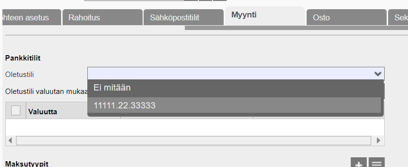 Omien asetusten "Myynti"-välilehdellä valitaan mikä pankkitili on oletus. Tämä tilinumero näkyy tilauksella ja laskulla sekä muissa maksudokumenteissa.