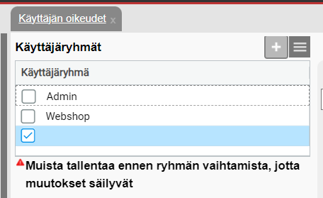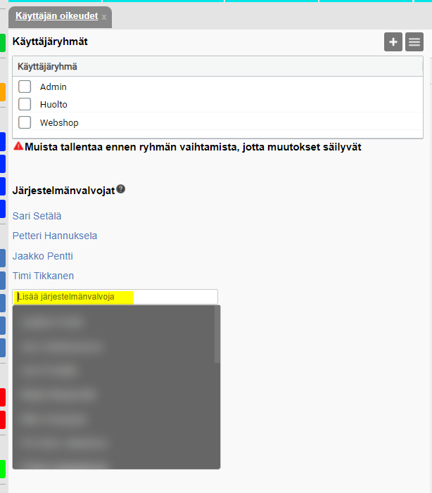HUOM! Vain järjestelmänvalvojalla on pääsy käyttäjien oikeuksien hallintaan. Jos sinulla ei ole admin-oikeuksia, voit pyytää järjestelmänvalvojaa lisäämään ne sinulle. Mikäli järjestelmänvalvoja puuttuu kokonaan, ole yhteydessä tukeen.