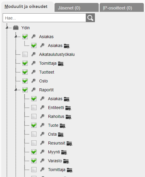 Huomioi myös, että saatavilla olevat toiminnot riippuvat siitä, mitä moduuleja on aktvoitu yrityksellesi. Jos siis esim. yritykselläsi ei ole sopimusta kirjanpitomoduulin käyttöön, et myöskään näe tätä vaihtoehtoa käyttöoikeuksien hallinnassa.