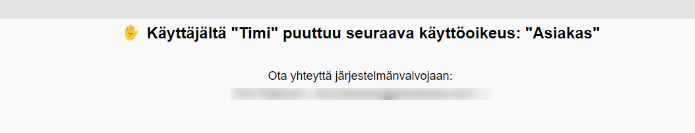 Jos käyttäjällä ei ole oikeuksia avata jotakin toimintoa, esim. asiakastietoja, tulee siitä tämän näköinen ilmoitus: