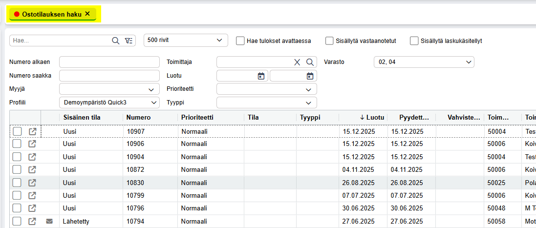 Jotta tuotteet saadaan saldoille, tulee ne kirjata varastoon vastaanottamalla ostotilauksilla olevat tuotteet. Vastaanotto tapahtuu Ostotilauksen haun kautta. Etsi siis ensin ostotilaus, jota olet ottamassa vastaan.