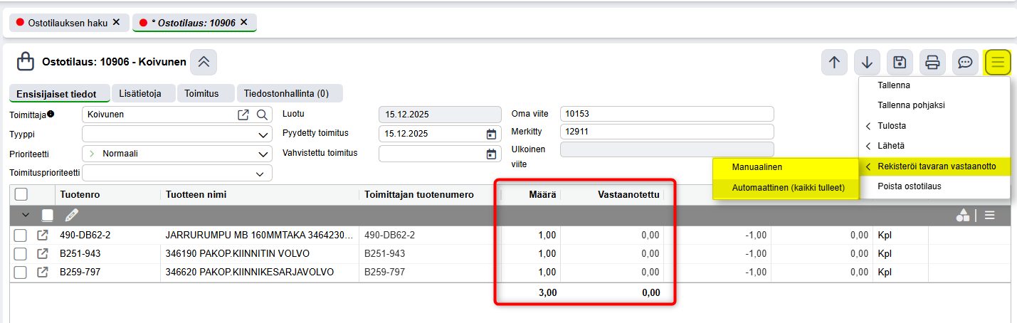 Vastaanottaaksesi tuotteita, avaa ostotilaus, jonka tuotteita on saapunut. Valitse oikeasta yläkulmasta Rekisteröi tavaran vastaanotto. Tässä on kaksi vaihtoehtoa: