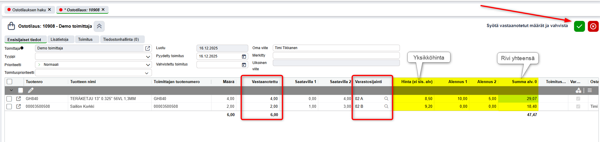 - Manuaalinen: Vastaanotettu-sarakkeeseen tulee kaikille tuotteille määräksi 0 ja jokaiselle riville syötetään erikseen määrä, montako niitä on saapunut.