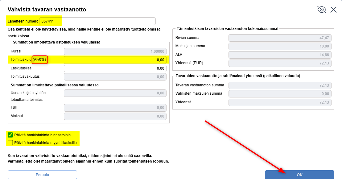 Vahvistamisen jälkeen aukeaa ikkuna, johon lisätään ensin lähetteen numero. Tässä näkymässä voidaan myös lisätä kuluja tuotteille, kuten esim. toimituskulu. HUOM! Toimituskulun summa lisätään verottomana. Tästä näkymästä on vielä mahdollista palata takaisin painamalla Peruuta-nappia, mikäli unohdit vaikkapa lisätä varastopaikat. Näkymän alaosassa on vielä kaksi valintaa: