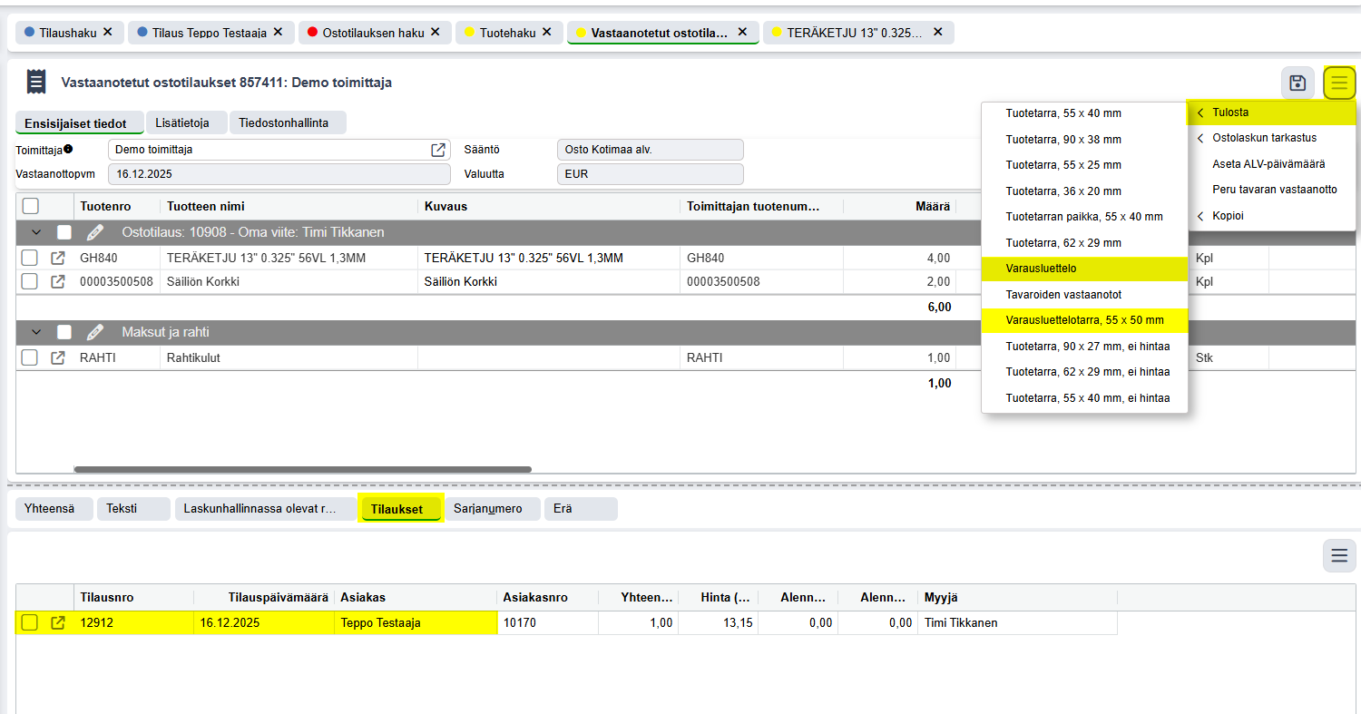 Nyt voidaan myös katsoa, kenelle tuotteet on tilattu. Tämä näkyy Tilaukset välilehdeltä. Myyntitilaukselle varatuista tuotteista voidaan myös tulostaa lista (Varausluettelo) tai tarrat (Varausluettelotarra) oikean ylänurkan valikosta kohdasta Tulosta. Samasta valikosta saa myös tulostettua tarrat tuotteille, jotka ovat menossa hyllyyn. Mikäli sopivan kokoista tarraa ei löydy valikosta, olethan yhteydessä asiantuntijoihimme.