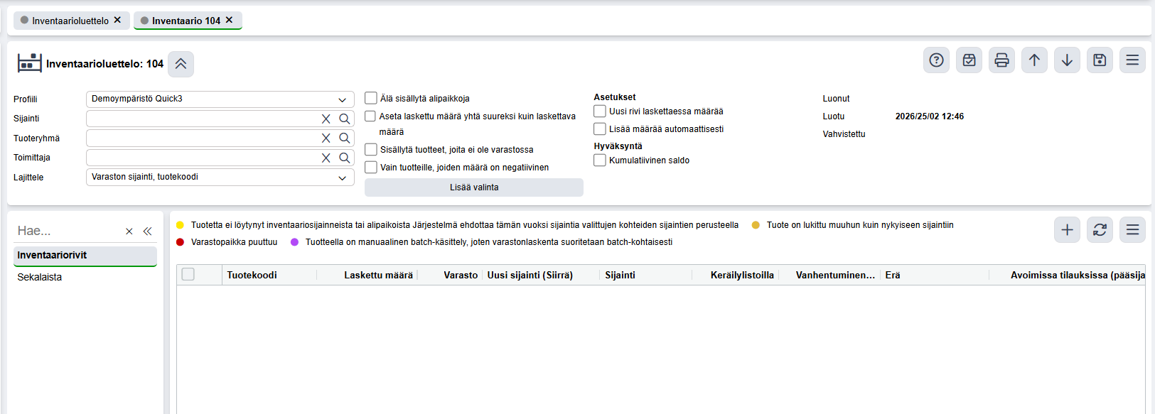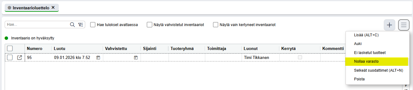 Inventaarion tekemiseen löytyy oma toiminto päävalikosta nimellä Inventaarioluettelo.