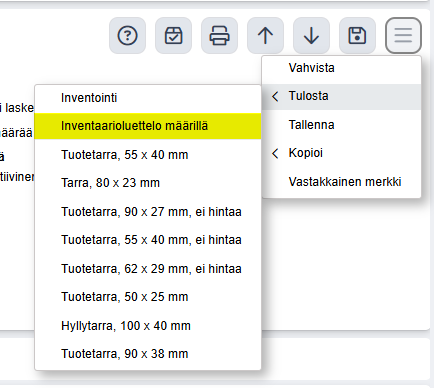 Vahvistetut inventaariolistat voi tulostaa tulostuskuvakkeesta inventaariolistanäkymän oikeasta ylänurkasta.