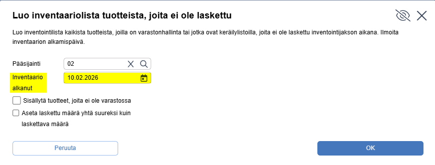 Syötä päivämäärä, jolloin inventointi aloitettiin. Tämä katsotaan inventointijakson alkamispäiväksi.