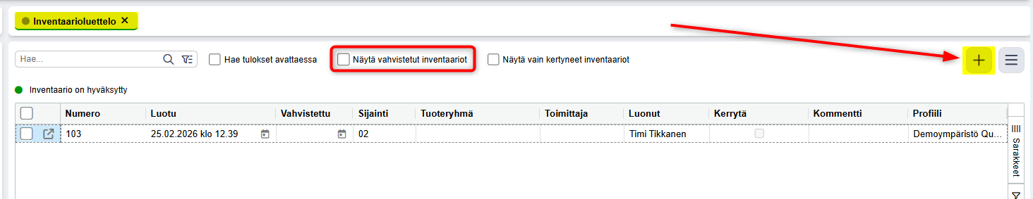 Inventaarioluettelo-näkymässä näet kaikki avoimet inventaariolistat, mutta saat myös jo vahvistetut näkymään valitsemalla Näytä vahvistetut inventaariot. Voit luoda uusia laskentalistoja painamalla plus-painiketta.