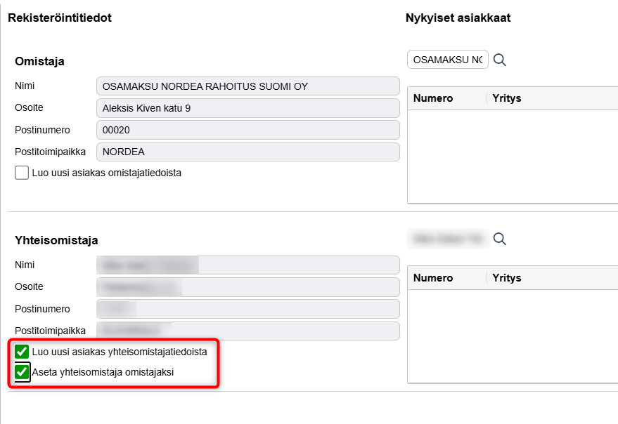 Mikäli omistaja on esim. rahoitusyhtiö, on omistajan alapuolella näkyvissä haltijan tiedot "Yhteisomistajana". Voit luoda uuden asiakkaan myös haltijan tiedoilla.