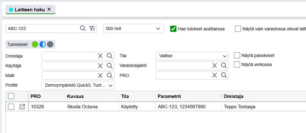 Quick3:ssa on integraatio Trafin ajoneuvorekisteriin, joka sisältää tarpeelliset tiedot kaikista rekisteröidyistä ajoneuvoista. Trafi-haku kannattaa ottaa käyttöön kaikissa yrityksissä, jotka myyvät tai huoltavat ajoneuvoja. Tämä helpottaa työtä ja säästää aikaa, koska kaikkia tietoja ei tarvitse etsiä manuaalisesti. Otathan yhteyttä tukeen, jos teiltä puuttuu tämä ominaisuus, ja haluaisitte sen käyttöön.