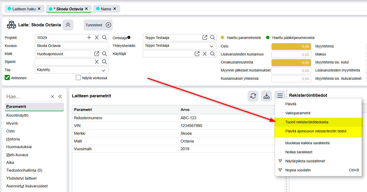 Voit vielä päivittää laitekortin tiedot valitsemalla joko Tuonti rekisteröintitiedoista (valikko aukeaa, jossa voit vielä vaihtaa tietojen haun laajuuden) tai Päivitä ajoneuvon rekisterikortin tiedot (haetaan samoilla tiedoilla kuin aikaisemminkin).