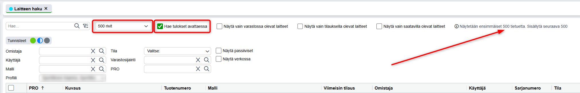 Jos haluat nähdä listan laitteista ilman rajauksia, voit painaa suurennuslasia syöttämättä hakuehtoja. Laitelistaus aukeaa myös automaattisesti, jos asetus Hae tulokset avattaessa on päällä. Oletuksena näytetään 500 ensimmäistä tulosta. Voit valita enemmän rivejä näkyviin hakukentän oikealla puolella olevasta alasvetovalikosta. Saat seuraavat 500 tulosta näkyviin painamalla Sisällytä seuraavat 500.