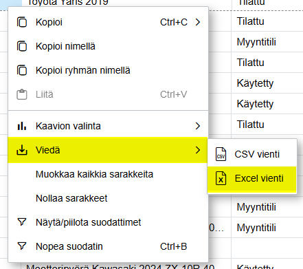 Voit myös helposti luoda Excel-tiedoston laitteista painamalla hiiren oikeaa rivien päällä: