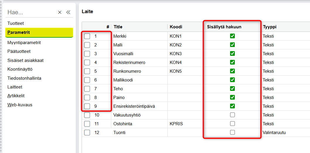 Laitehaussa näkyvät Parametrit ovat niitä kenttiä, jotka on Merkki- ja mallipuussa rastitettu sisällytä hakuun. Jos kentässä ei ole tätä rastitettuna, kyseisen kentän perusteella ei voi hakea laitetta. HUOM! Tässä voidaan käyttää vain parametrejä 1-9.