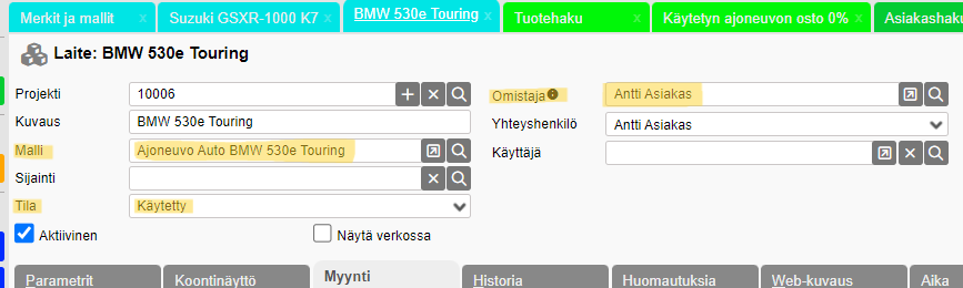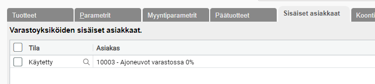 - Laite on sisäisen asiakkaan omistuksessa, jotka on määritetty Merkit ja mallit --> Sisäiset asiakkaat. Myynti ei onnistu, jos omistajana on joku muu kuin sisäinen varastoasiakas.