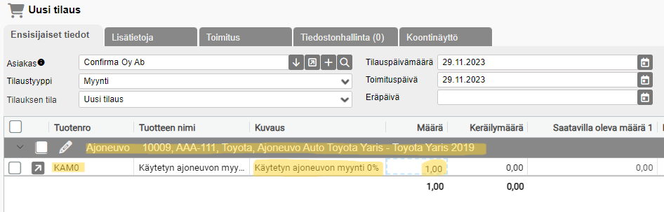 Päätuotteiden (ajoneuvojen/laitteiden) laskutus hoidetaan myös Myyntitilauksen kautta, kuten muidenkin tuotteiden, mutta niiden kanssa on huomioitava tiettyjä asetuksia ja määrityksiä.