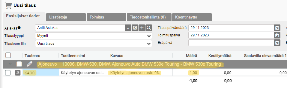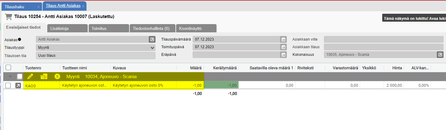 Ostettaessa käytetään myös yleiskoodia verokannan mukaan. Tämä myös siinä tapauksessa, jos yrityksesi ostaa takaisin uutena myydyn laitteen esim. parin vuoden jälkeen. HUOM! Ostossa määräksi laitetaan aina -1! Vaihtolaite voi olla myytävän laitteen kanssa samalla tilauksella omalla lohkollaan, tai siitä voidaan tehdä kokonaan oma tilaus.