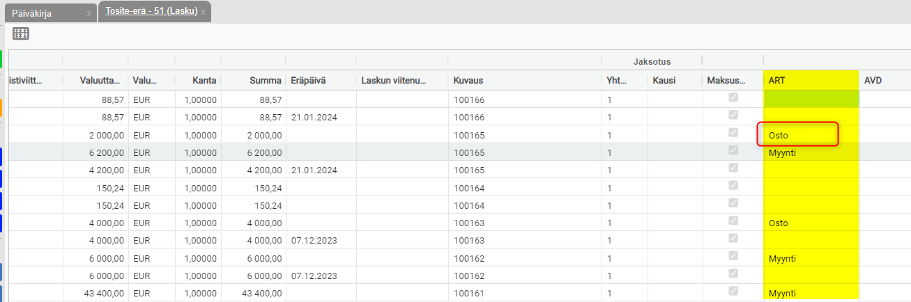 - Jotta uuden laitteen ostohinta menee oikein, on ostolasku kirjattava oikealle projektinumerolle sekä sen dimensio ART on asetettava arvoon "Ostohinta". Tämä tehdään päiväkirjassa tai dokumenttikeskuksessa.