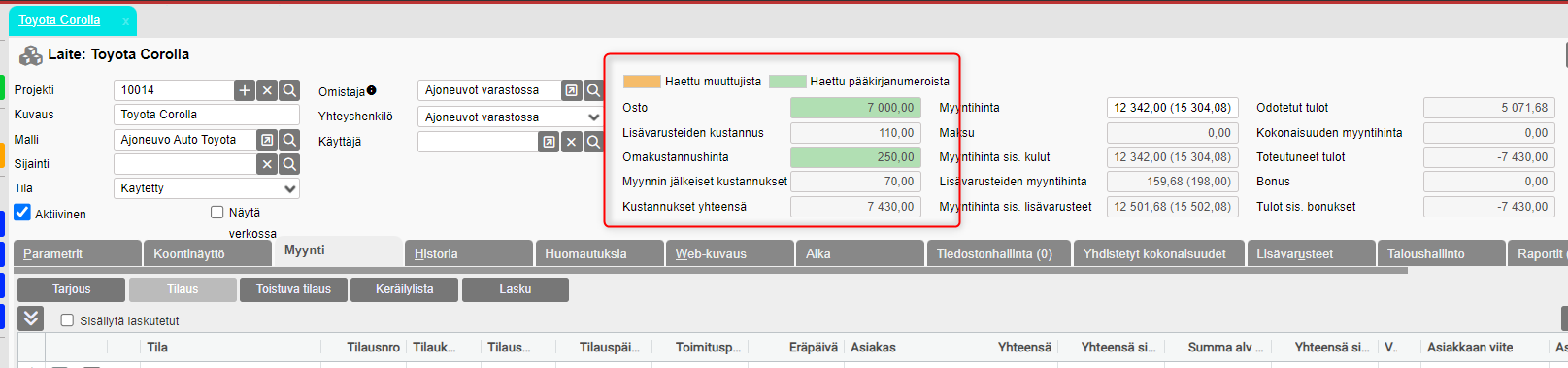 - Osto- ja korjauskustannusten yhteissumma lasketaan kustannushinnaksi, kun laite lisätään tilaukselle, ja se lasketaan uudelleen laskutettaessa