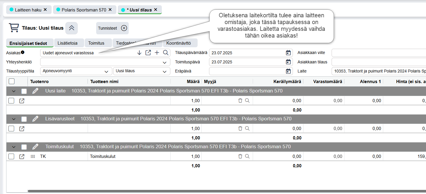 - HUOM! Jos teet laitemyynnin laitekortin kautta, muista vaihtaa oikea asiakas myyntitilaukselle! (Mikäli varastoasiakasta laskutetaan, kirjataan tapahtuma kuluiksi laitteelle. Tämäkin on tietysti tarpeellista joskus.)