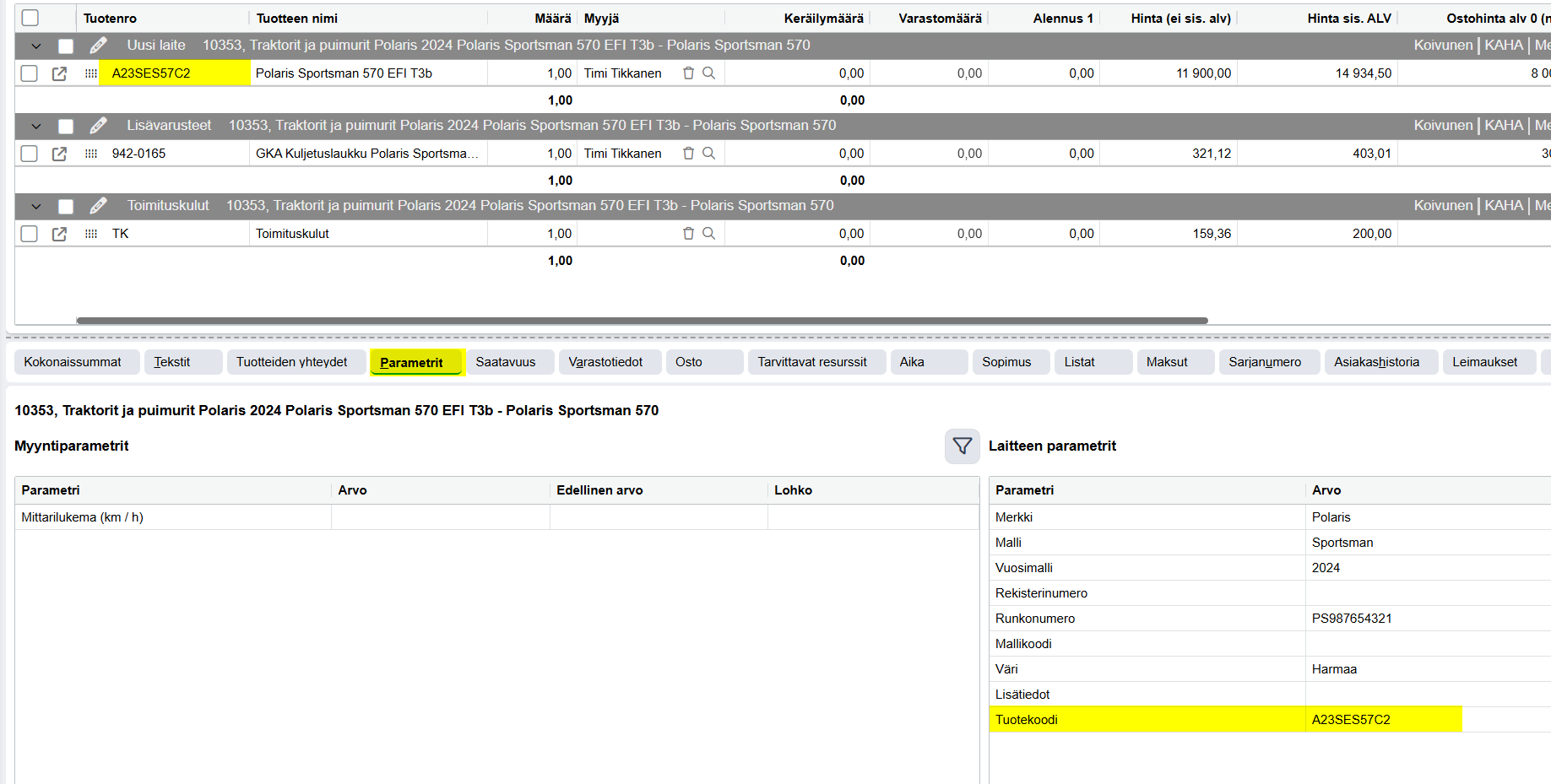 - Tuotekoodit voi olla kätevää laittaa Merkki- ja Mallipuuhun oletusarvoiksi, jolloin oikean koodin voi katsoa helposti myyntitilauksella Parametrit-välilehdeltä.