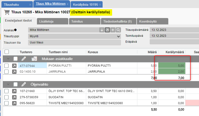 Tilauksen yläosaan tulee tieto siitä, että se on osittain keräilty. Kerätyt tuotteet näkyvät vihreällä pohjalla.