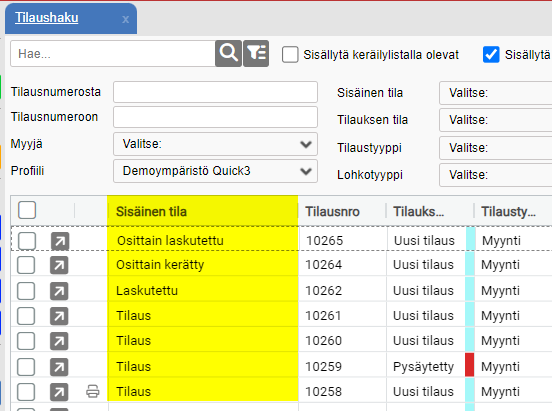 Tilauksen sisäiset tilat