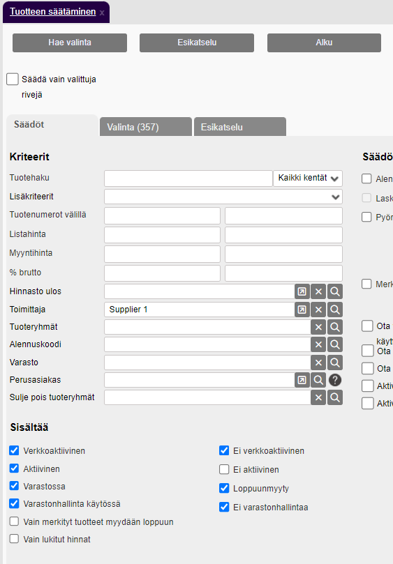 Anna mahdollisimman tarkkoja kriteerejä, jotta valinta rajautuu vain niihin tuotteisiin, joita on muutettava. Voit toimittajan ja tuoteryhmän lisäksi antaa myös muita kriteereitä. Suosittelemme ennemmin suorittamaan tämän useissa eri vaiheissa rajoitetulle tuotevalikoimalle kuin sisällyttämään liikaa yhteen ajoon. Tämä voi tehdä tarkistamisesta helpompaa ja selkeämpää esikatselun aikana. Jos muutat kriteereitä, sinun on painettava "Hae valinta" päivittääksesi tuotevalinnan uudelleen.