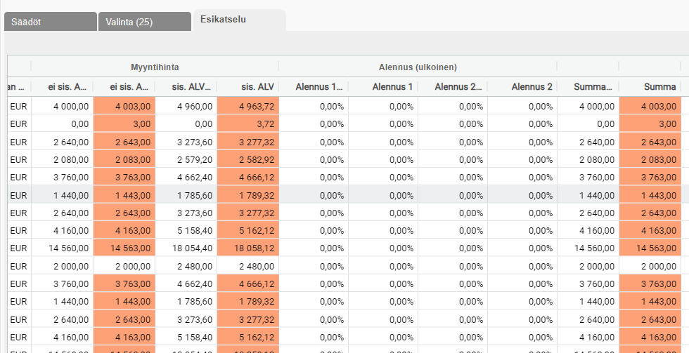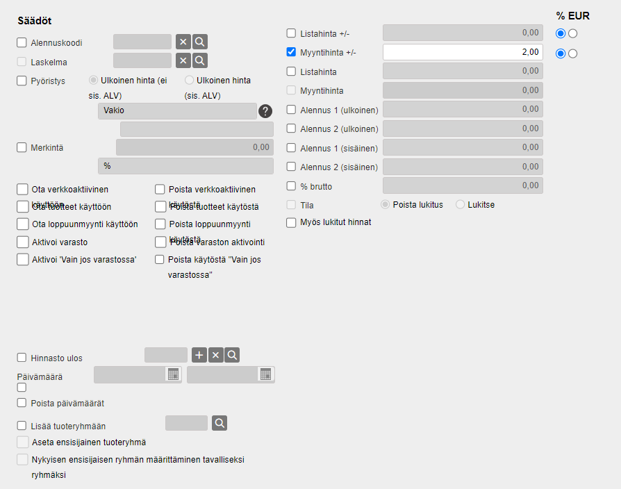 - Myyntihinta +/-: Muuta myyntihintaa prosentteina tai euroina (rastita oikea tyyppi)