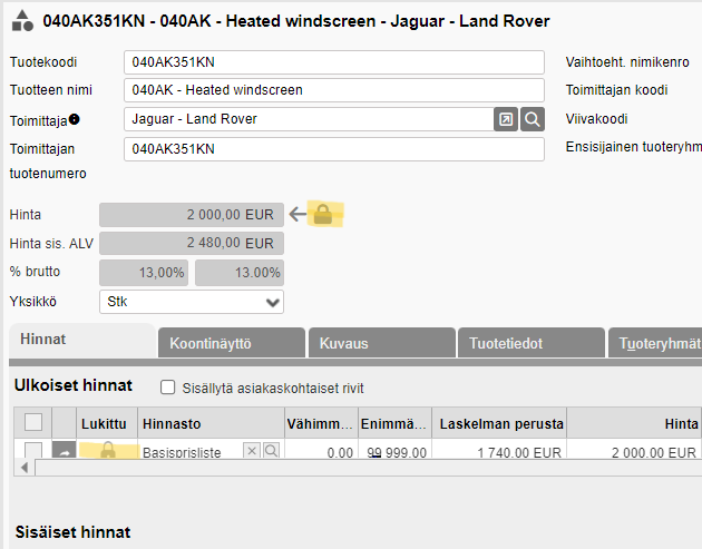 Jokaisen tuotteen hinta on mahdollista lukita, mikä tarkoittaa, että hintaa ei päivitetä eikä muuteta hintapäivitysten mukaisesti. Tämä toiminto aktivoidaan ruksaamalla vaihtoehto joko hintaluettelon asetuksissa tai suoraan tuotteen "Hinnat"-välilehdellä. Jos tuotteen hinta on lukittu, näet lukon symbolin tuotteen vieressä.
