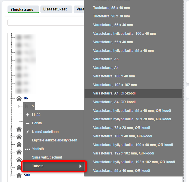 Sekä inventaarion tekeminen että liikkuminen varastossa tehostuvat, kun varastopaikat on merkattu selkeästi. Voit tulostaa tarroja varastopaikoille Varastosijainnit -> Yleiskatsaus -näkymässä. Paina hiiren oikeaa haluamasi sijainnin päällä ja valitse Tulosta.