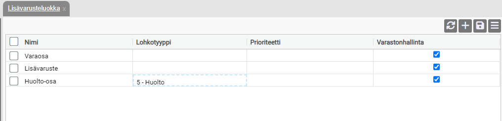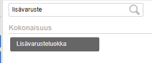 Ensin sinun on kuitenkin määriteltävä lisävarusteluokat. Näitä on mahdollista muokata tarvittaessa myöhemminkin. Lisää tähän eri tyypit, joita haluat käyttää, esim. lisävarusteet, varaosat ja huoltotarvikkeet (nämä siis voivat olla muutakin kuin vain lisävarusteita). Pääset muokkaamaan näitä päävalikon "Lisävarusteluokka" -valikon kautta. Tässä voit myös määrittää lohkotyypin, jos tuote vaatii tietyn tyyppisen lohkon tilauksella.